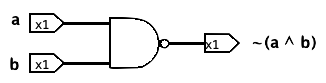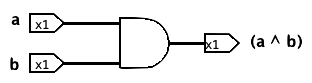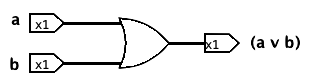 The circuit is the visual layout of a statement using logic gates. Each operation is described by a gate that has inputs connected to its left side and the output on its right side. Each gate's output can be used as an input to another gate, cascading in the same way that expressions can be composed. A wire can come from one input to the circuit or the output of one gate, never more than one. We cannot wire two circuit inputs or gate outputs together directly. Finally, no path along wires and forward through gates in the circuit can loop back on itself.