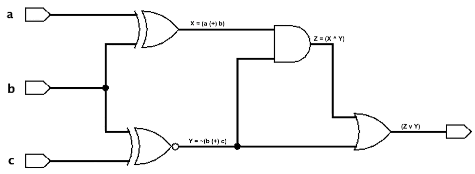 This circuit represents the expression (((a (+) b) ^ ~(b (+) c)) v ~(b (+) c)), and it shows the output for the inputs a = false, b = true, and c = false.