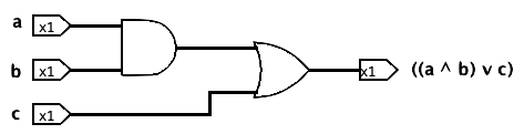 The order of operators may impact the final truth value; to avoid ambiguity, each operator in an expression has to be described within round brackets (no different brackets are allowed). Furthermore, in this course, we will not allow gates or expressions with three inputs. Therefore, (a v b ^ c) is considered ambiguous and incorrect and should be expressed as either ((a v b) ^ c) or (a v (b ^ c)). Furthermore, (a v b v c) is considered incorrect as well (although not ambiguous) and should be written as either ((a v b) v c) or (a v (b v c)).
