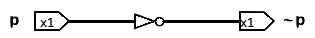 Finally, another representation of this operator is by drawing its logic gate. In a circuit, the inputs, in this case p, enter a gate, being modified by them and generating an output, in this case ~p. Therefore, NOT is represented using a NOT gate, which has one input and one output and looks like a triangle with a circle at its tip: