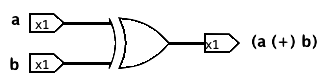 When representing the XOR operator in a circuit, we use the following gate (which looks like an OR gate with a second parallel arc on its inputs):