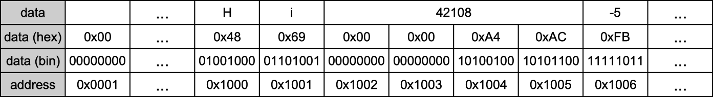 In this example, the address 0x1000 in this memory stores 0x48 (or 01001000 in binary), which represents the character H in ASCII code and the address 0x1001 stores 0x69 (or 01101001 in binary), which represents the character i in ASCII code. The address 0x1002 has the integer 42108 represented as a 32-bit unsigned integer as 0x0000A4AC using 4 memory spaces. Finally, the address 0x1006 has the integer -5 represented as a 8-bit unsigned integer as 0xFB using only 1 memory space.